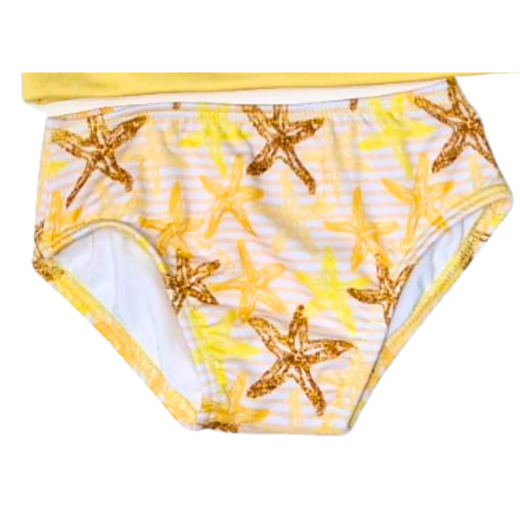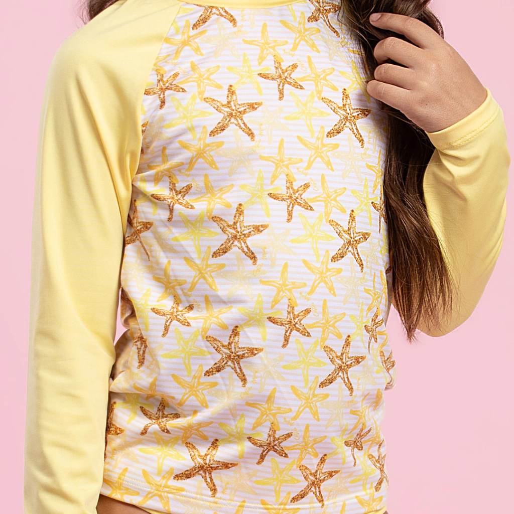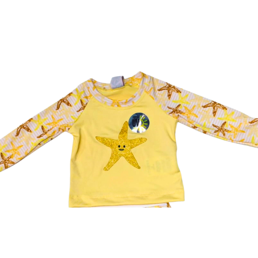 O Conjunto Infantil UV Manga Longa Amarelo Estrela Do Mar e ideal para garantir seguranca e conforto nos dias de praia ou piscina. A blusa estilo rash guard possui mangas longas em rosa claro e estampa listrada com cores alegres alem de protecao UV50 que bloqueia ate 98 por cento dos raios solares nocivos. A calcinha lisa com forro combina perfeitamente trazendo um visual moderno e delicado e nã acumula areia