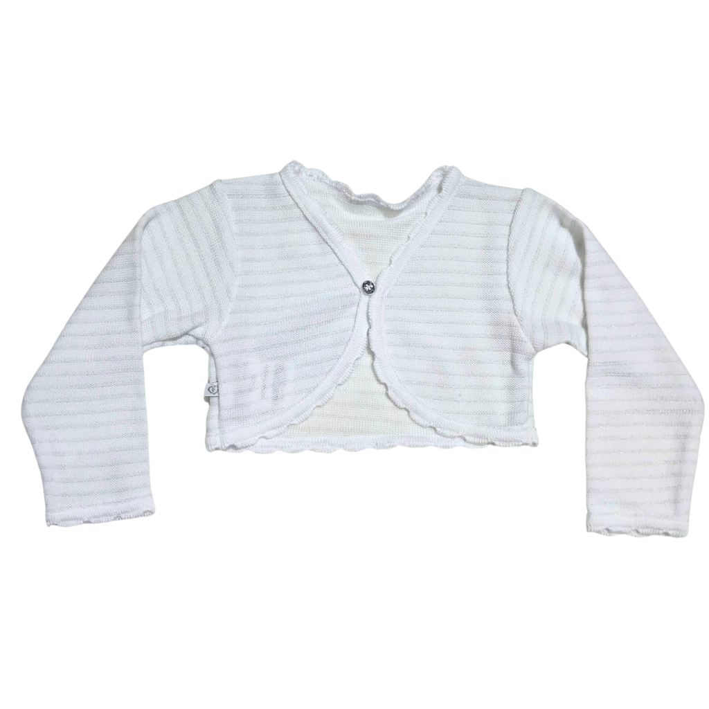 Disponível em diferentes tamanhos e cores, o Bolero Infantil em Tricô com Brilho e Botão é a escolha perfeita para garantir conforto e um visual encantador para as pequenas.