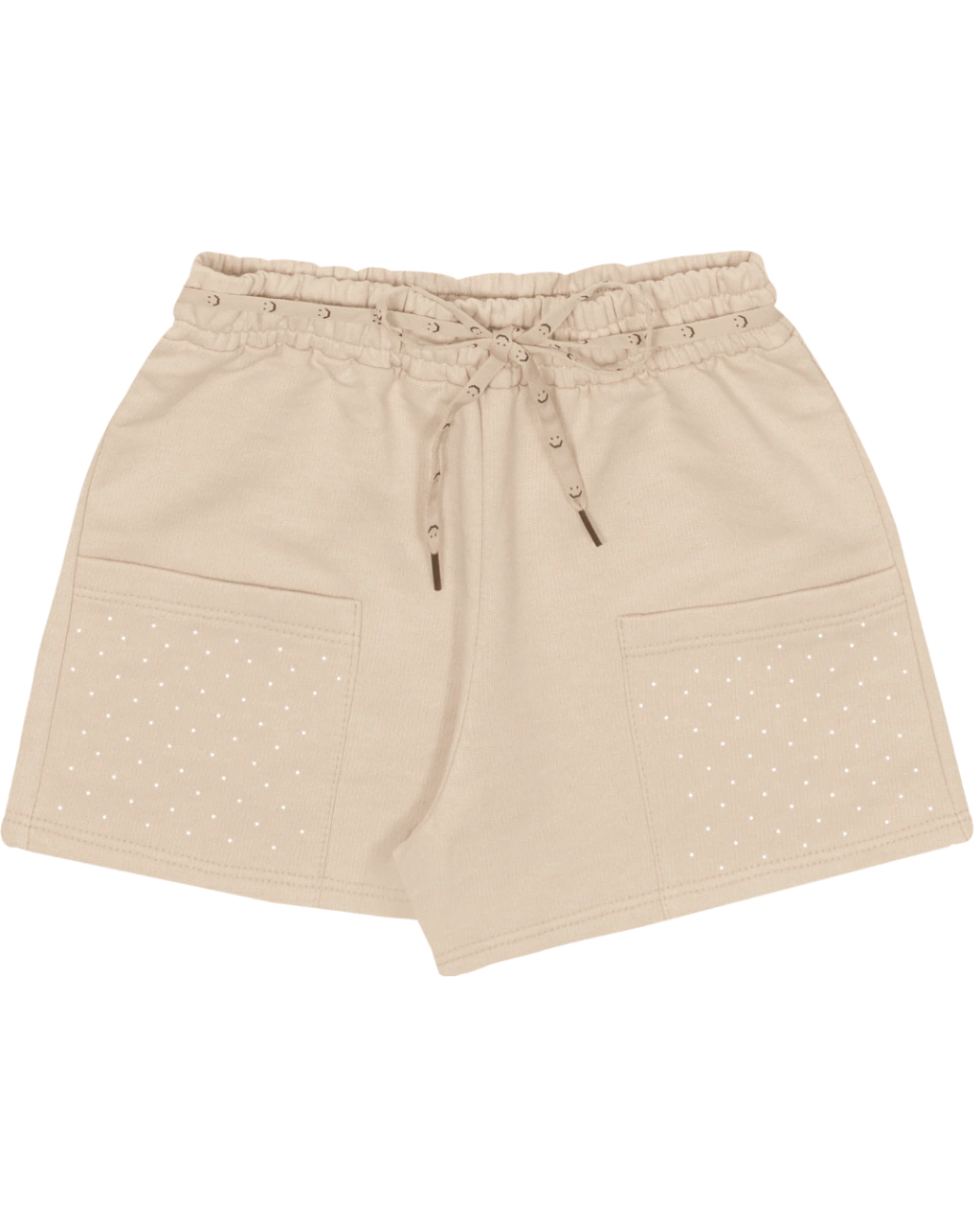 O shorts moletinho fit, feito em 100% algodão, proporciona liberdade de movimento e leveza. Conta com bolso decorado com pedras de strass e cinto de cordão, garantindo um visual moderno e prático para o dia a dia.
