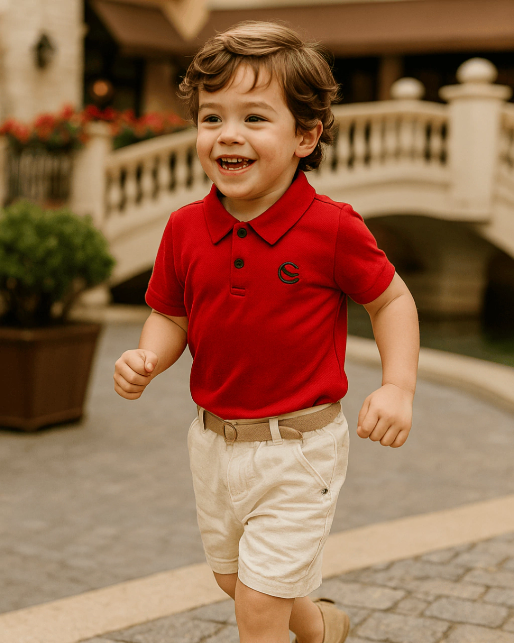 O look combina elegância e conforto, sendo ideal para festas, jantares e momentos em família. A polo vermelha traz o espírito natalino, enquanto a bermuda clara cria um contraste sofisticado. Uma opção versátil e estilosa para vestir os pequenos com charme e personalidade.
