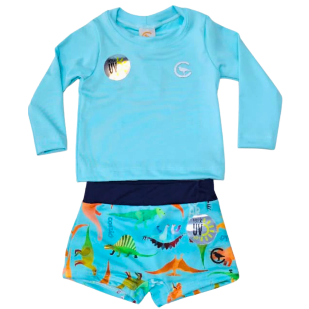 Garanta proteção e estilo para seu filho com este conjunto infantil para praia e piscina. A blusa manga longa em azul agua viva com tecido tecnológico oferece proteção solar UV 50+ permanente, bloqueando até 98% dos raios nocivos. Acompanha sunga confortável com estampa dinossauro, ideal para brincar com segurança e liberdade. Desenvolvido com tecido leve, de secagem rápida e toque macio, é perfeito para dias de sol, praia ou piscina.